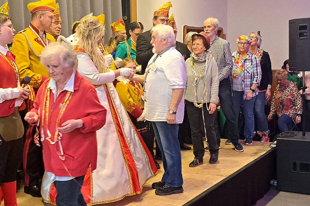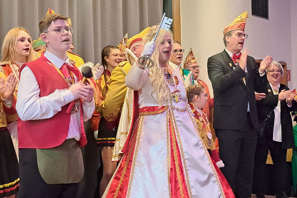Die Stimmung war großartig als Prinzessin Colette I. und Küfer Rodney I. an Weiberfastnacht mit ihrem Gefolge die SuppenKirche im großen Saal der Hoffnungskirche besuchten. Sie brachten den Stadtschlüssel mit, der kurz zuvor von Bürgermeister Sacha Reichelt übergeben wurde, als Zeichen für das nun beginnende närrische Regiment in Euskirchen.