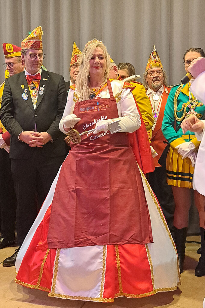 Colette I. dankte ausdrücklich dem Team der SuppenKirche für das tolle Engagement, das die Ehrenamtlichen Woche für Woche leisten. Traditionell wurden Küfer und Prinzessin zum Jungkoch bzw. zur Ehrenköchin der SuppenKirche ernannt und erhielten die rote Schürze.