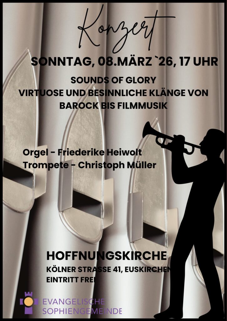 Erleben Sie am Sonntag, 08.März 2026 um 17 Uhr in unserer Hoffnungskirche die faszinierende Klangvielfalt von Trompete und Orgel in einem Konzert, das musikalische Welten verbindet: von der festlichen Strahlkraft des Barock über die Romantik bis zu klanggewaltigen Werken aus der Moderne und der Filmmusik.