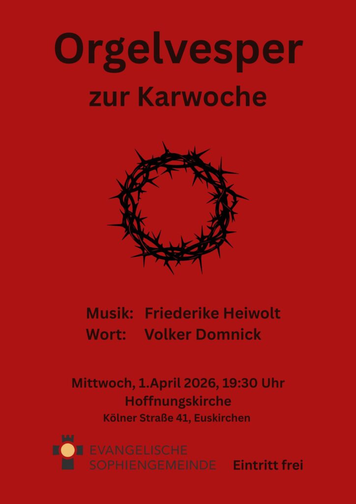 Am Mittwoch, den 01. April laden wir um 19:30 Uhr in die evangelische Hoffnungskirche (Kölner Str. 41 in Euskirchen) zu einer Orgelvesper ein mit besinnlicher Musik zur Passion und geistlicher Meditation zu Momenten der Einkehr und des Innehaltens ein.