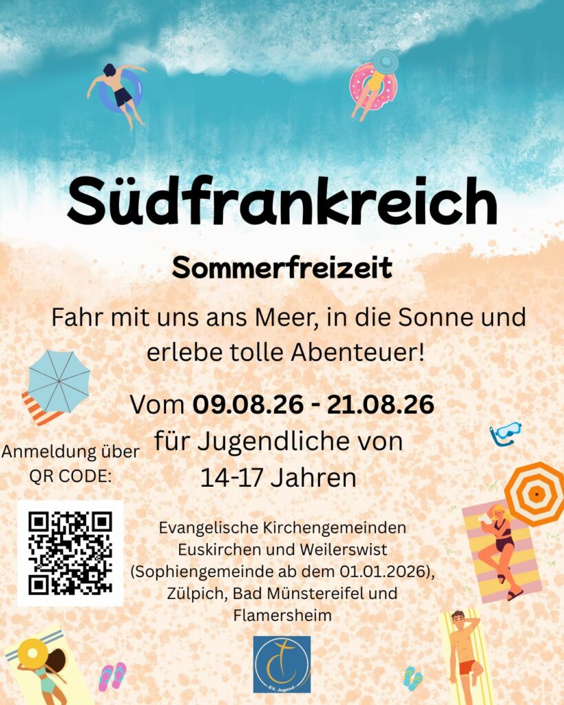 In den Sommerferien geht es 1-2 Wochen auf große Reise. An diesen Sommerfreizeiten können alle Jugendlichen zwischen 14 und 17 Jahren teilnehmen, unabhängig von ihrem aktuellen Wohnort oder ihrer Konfession. In den letzten Jahren waren wir u.a. an der französischen Mittelmeerküste und in Bayern in den Bergen. Mal sehen, wo es in den nächsten Jahren so hin geht.